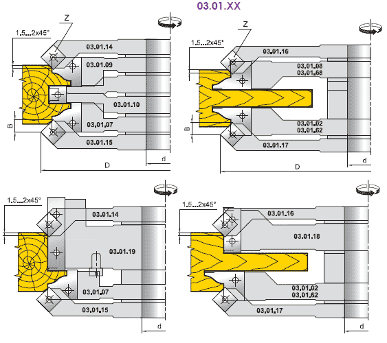 1. Комплект фрез для профілювання стояків та перемичок фільончастих дверних полотен (03.01.XX) Комплект фрез для профілювання стояків та перемичок фільончастих дверних полотен (03.01.XX)